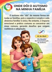 A Associação de Pais e Amigos dos Autistas de Patos e Região (ASPAA) realiza, ao longo do mês de abril, a campanha “Onde dói o autismo na minha família”, com uma programação voltada à conscientização sobre o Transtorno do Espectro Autista (TEA) e os desafios enfrentados pelas famílias. A iniciativa conta com o apoio da Prefeitura de Patos.